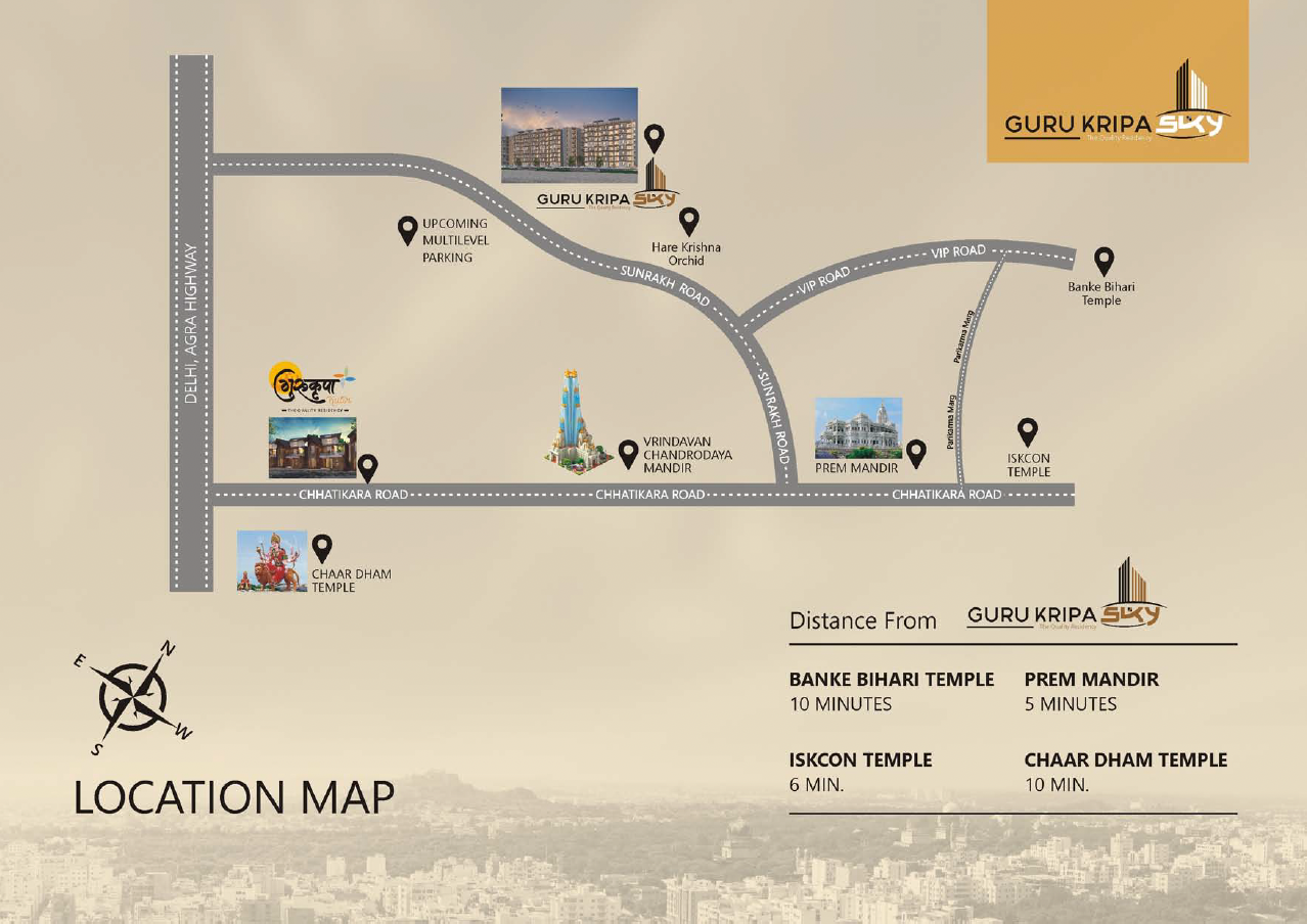 One of the biggest highlights of Guru Kripa Sky is its strategic location. The project offers easy access to Vrindavan’s most revered temples and major routes, making commuting and connectivity effortless.